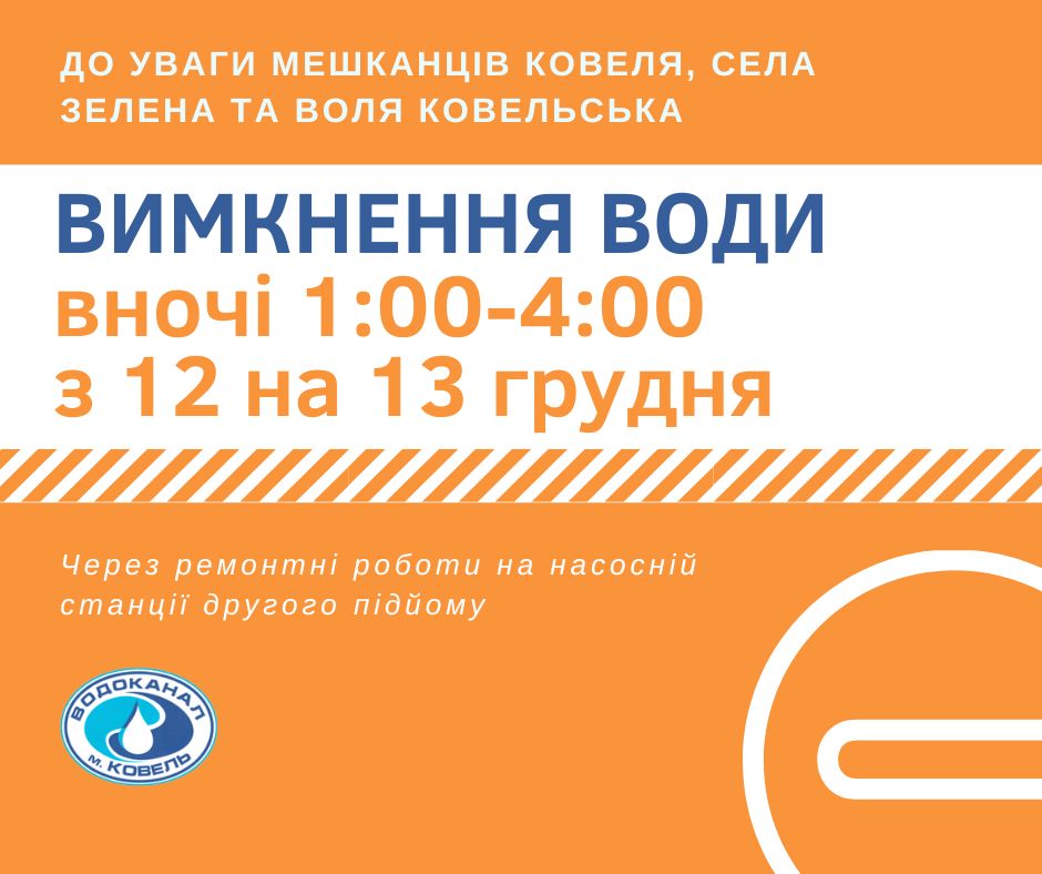 З 1:00 до 4:00 без води будуть мешканці всього Ковеля, а також села Зелена та Воля Ковельська.12-12-2024